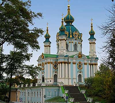 Храм, названий на честь Андрія Первозванного, — чи не найкращий київський храм, один із символів міста. Його легкий, елегантний силует неначе злітає над стародавнім Подолом. У літописах розповідається, що в 40-х роках нової ери апостол Андрій проповідував християнство на території нинішньої України. На місці, де тепер стоїть церква його імені, Андрій поставив дерев’яний хрест і, звертаючись до учнів, які супроводжували його, сказав: “Бачите ці гори? На цих горах засяє благодать Божа, буде місто велике, і воздвигне Бог багато церков”. Через чотири з половиною століття пророцтво збулося. В XI ст. на місці легендарної події кияни збудували дерев’яний храм. Церкви, що називалися андріївськими або хрестоздвиженськими, були тут і в наступні століття. Остання з них 1724 року “від великих вітрів розвалилася”, і невдовзі її розібрали. Історія нинішньої почалася в 1744 p., коли Київ відвідала імператриця Єлизавета Петрівна. Вона побувала в багатьох святих місцях, зробила великі пожертвування різним церквам і монастирям. А головне, імператриця вирішила збудувати в Києві свою літню резиденцію — палац і церкву. Для палацу місце вибрали на Печерську (будівля простояла недовго: в 1870-х pp. на її місці та за її зразком збудували Маріїнський палац). А церкву вирішили звести на Андріївській горі, заввишки 100 м над Дніпром. Палац і палацова церква були досить “рознесеними” у просторі. Пояснити це можна повагою до святині, пов’язаною з іменем апостола Андрія, якого вважали покровителем Російської імперії. Урочисті закладини нового храму відбулися 9 вересня 1744 р. Процесія рухалася з боку Дніпра. Єлизавета Петрівна, яка очолювала похід, Олексій Розумовський і митрополит Рафаїл Заборовський, котрі йшли за нею, а також інші учасники процесії несли в руках по три цеглини. Перший камінь заклала імператриця. Проектування нової церкви доручили Йогану Готфріду Шеделю — відомому київському архітекторові, котрий збудував Велику дзвіницю Києво-Печерської лаври та очолював роботи під час надбудови дзвіниці Софійського собору. На початок 1745-го план церкви і креслення фасаду були готові й відправлені до Петербурга. Шедель задумав збудувати також дві тріумфальні арки, що мали прикрасити під’їзди до церкви з боку Подолу та нинішньої Володимирської вулиці. Однак проект було відхилено. Розробку нового імператриця доручила Франческу Бартоломео Растреллі (1700—1771). Від нього вимагали виготовити не тільки загальний план будівлі, а й креслення найдрібніших деталей, аж до ліпних і різьблених орнаментів. Архітектор саме працював над проектом Смольного монастиря, проте розробив проект храму і надіслав його до Києва. З усіх будівель зодчого Андріївська церква в Києві за розмірами найскромніша. Але за своїм композиційним вирішенням, гармонійним поєднанням архітектурних форм і ландшафту вона найвишуканіша у спадщині славетного архітектора. 13 серпня 1747 р. новий проект затвердили. Для його втілення до Києва направили “архітектурну команду” Петербурзької канцелярії з будівництва московського архітектора Івана Федоровича Мічуріна, який очолив роботи. Будівництво храму розпочали наприкінці серпня 1748 р. Найбільшу проблему становили насипні ґрунти бастіону та джерельні води гори; довелося забутувати основу під фундаменти, а для відведення джерельних вод копати дренаж